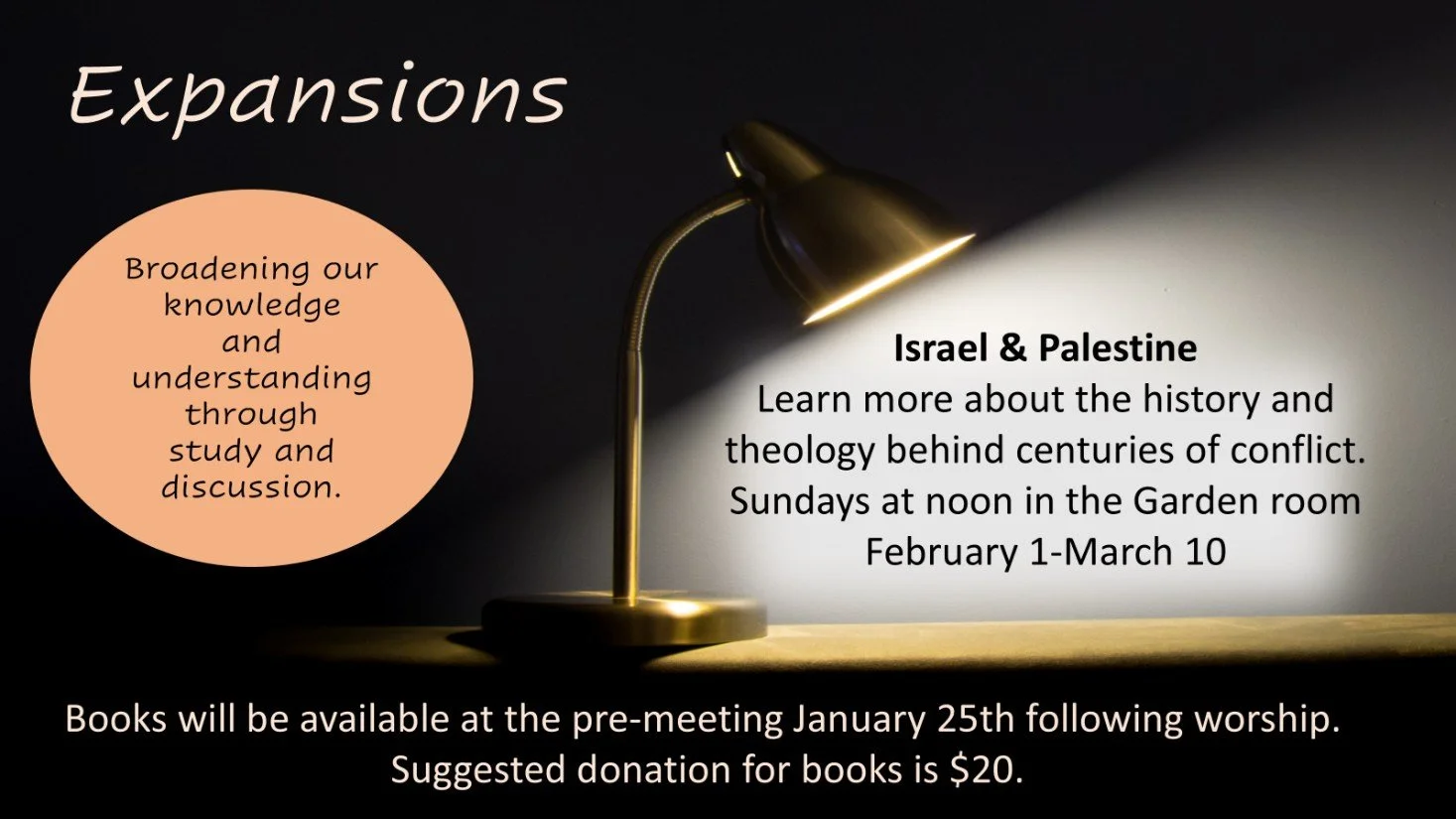 Learn about the history and theology behind centuries of conflict between Israel and Palestine. Classes are at noon Sundays in the Garden room through March 10.
